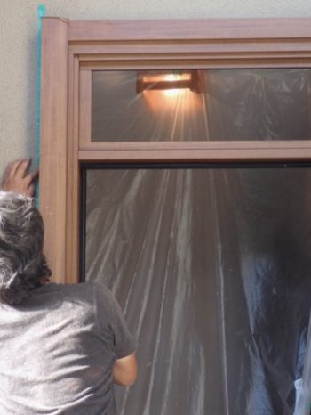 下枠の緑色はコーキング打ち立てで埃が付きやすいのでただの養生です。
