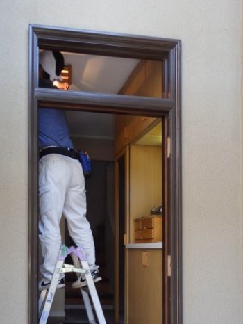 今回、お施主様の御希望でドア幅を小さくしたくないとのことで、既存木枠縦部を丸ノコでカットし開口部を広げました。