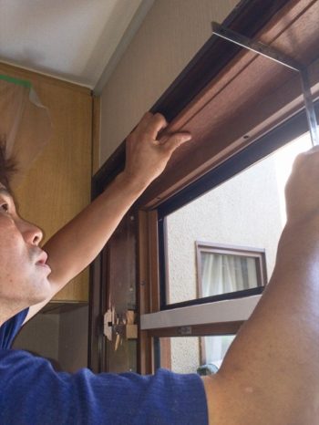 新設枠の取り付け作業中です。微調整をしながらビス打ちします。