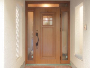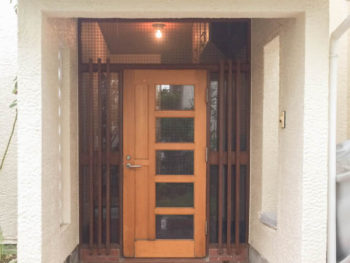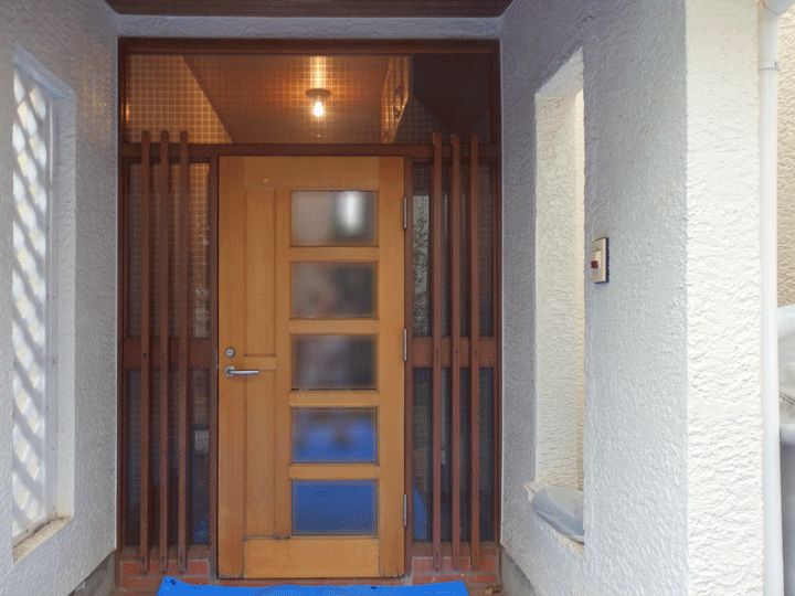 木製の玄関からのお取替えとなります。左右の縦格子も木製です。
