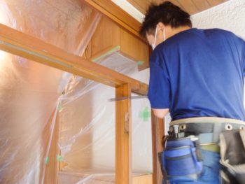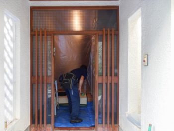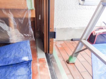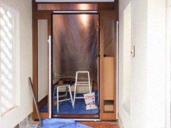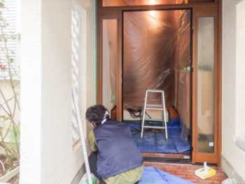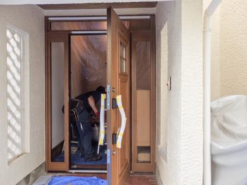 リフォーム工事開始です。まず、既存ドアの撤去と枠の解体作業から始まります。
