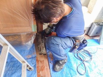 既存枠両袖の下部はタイルで立ち上がっているため削りながら取り除いてしまいます。