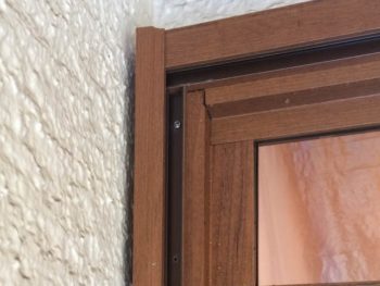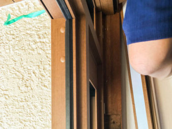 両袖のガラスに防犯ガラスがはめ込まれました。そして外額縁の周囲をコーキングする作業を行っています。