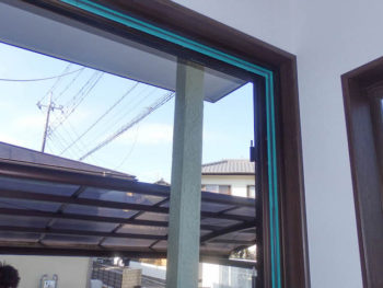 同じく室内側の写真です。緑色のテープが張ってあるところが新旧の枠の境目の部分です。この数ミリの隙間に同色のコーキング処理をしていきます。