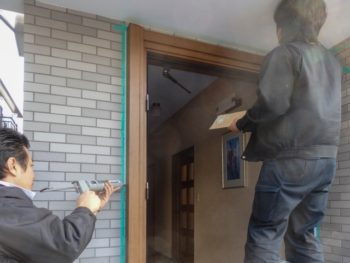 今までの玄関枠と新しい枠には隙間がありますので、止水のためのコーキングをたっぷり打ち込みます。