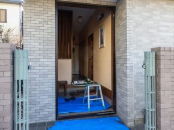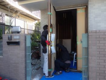 枠周りのパッキンや金具類も全て取り除きます。これで、新しい玄関枠の取り付けができるようになります。