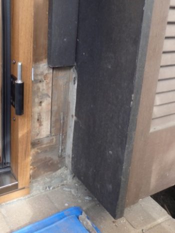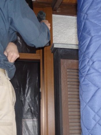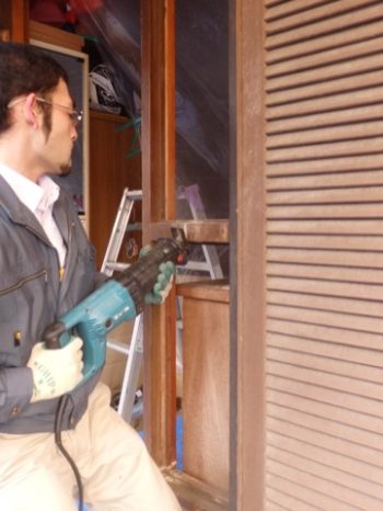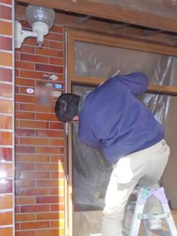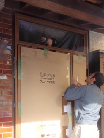 既存の玄関は木製枠・木製扉の玄関ドアです。袖の腰部はタイル張り、ランマ付の立派な玄関です。今回は店長/モリモトとスタッフ/トザワが実際の工事を担当します。もちろん、担当のスタッフ/社長も立ち会います。