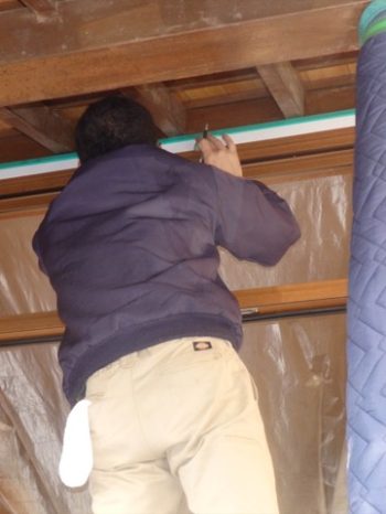 玄関ポーチ下の垂木に合わせて上用カバー部材を切り込み合わせていきます。