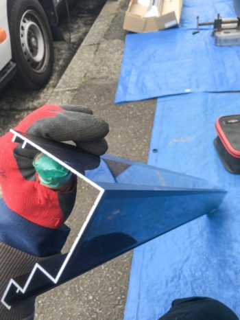 こちらは外部用の上部カバー材の断面です。5mm刻みでカットできるようになっています。今回は外壁の出に合わせて矢印のところで切断します。