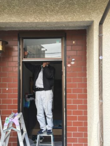 外部額縁の取り付けコーキングも終わり、本体を吊り込んで最終的な調整をします。