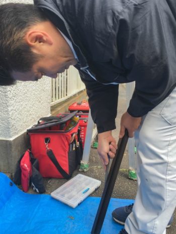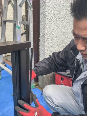 下枠の立ち上がりを合わせるために一部部材のカットをしています。