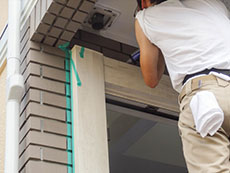 外壁と額縁の取り合いにもシール打ちするためマスキングテープを貼っています。