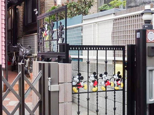 正面のフルカラーミッキーさんの門扉と新しくできた通路にフルカラー(ひとり)のフェンス。