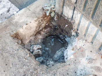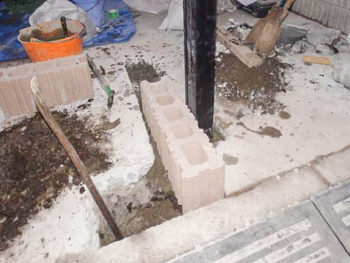 既存の柱を抜きます。そのために柱の根本のコンクリートに切り込みを入れ、斫り機で砕いて掘り込みをします。(画像は駐車場側)