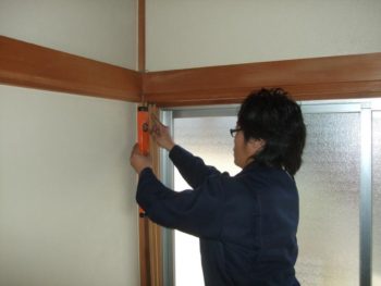 既存の柱に歪みが生じていたので、プラマードUの縦枠を水平垂直に気を付けながらビスを打ち込んでいきました。