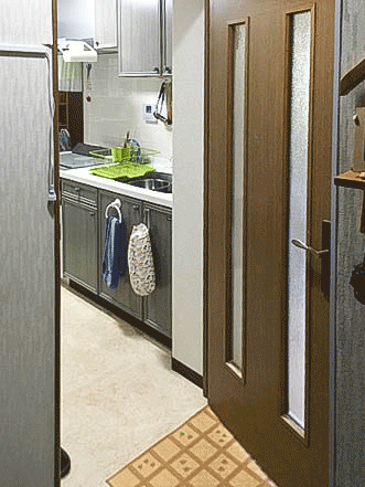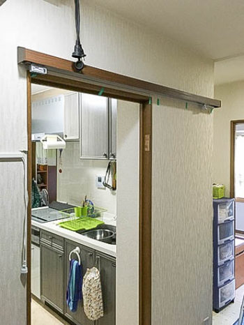 | お客様のご要望 | 『キッチンの室内開き戸を引戸に変更したいのですが可能でしょうか? 気密性は必要ありません』 とのお問い合わせでした。廊下に面しているキッチンの開き戸とトイレの開き戸を同時に開けてしまうとドア同士がぶつかってしまうのが長年の悩みだったようです。 |