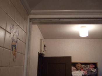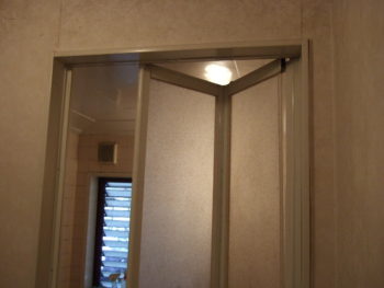 古い折れ戸(上吊り式)を外す作業から始まります。年代やメーカーによって構造が異なるため時間がかかる事もあります。