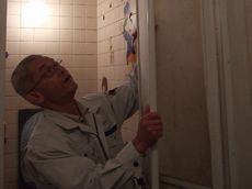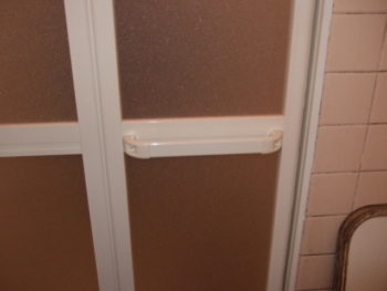 新しい浴室折戸を戸車の向きに気をつけながら吊り込みます。(注)吊元が逆の場合は枠上部のストッパーを入れ替えます。写真は左吊元(浴槽側から見て)のため、そのままでした。