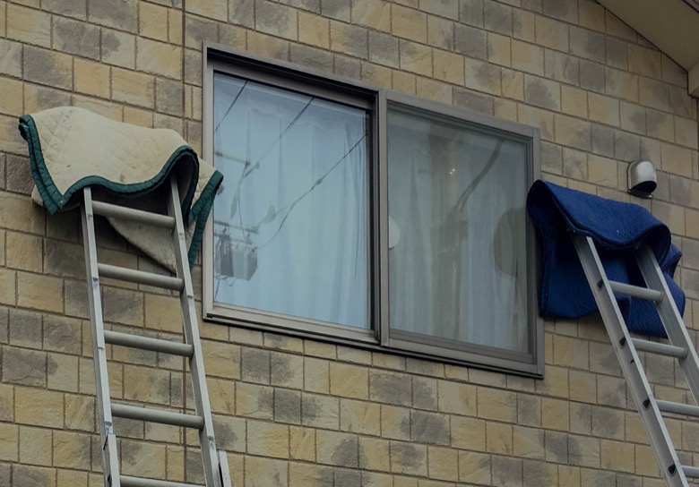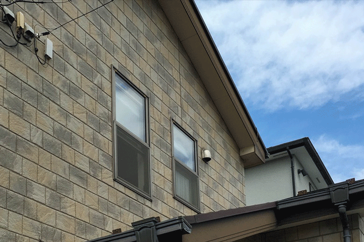 | 【施工前】 2階は2練バシゴを立てて2人での作業です。 |