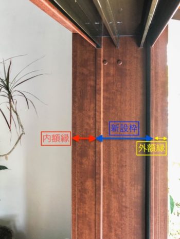 外部、外額縁たて部材。壁より少し出っ張ってしまいますが、元の枠を残したままの施工となりますのでカバー工法上の特徴となります。