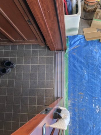 扉の撤去とランマなど取り外して、無目も切断撤去します。下枠の状態があまり良くなかったため(中央が浮いている)、下枠も取っ払いました。