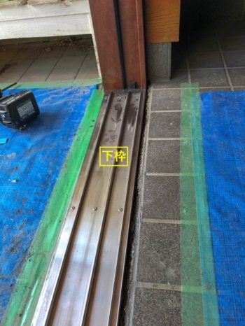 よくある形のアルミ製の引戸です。アルミ部分のサビがかなり浮いてきていました。それと、戸車の具合も悪くなっていました。