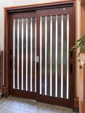 | ご提案内容 | リシェント引戸15型木目ポートマホガニー。すっきりランマ無しの2枚引戸。高さが2m26cmで重量もあるので、常時開閉する側に大きめの外部ハンドル引き手をご提案しました。 |