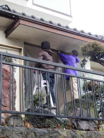 いよいよ工事開始。不要となる部分を切断(カバー工法なので外壁は壊しません。)