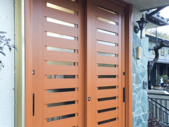 | 使用商材 | LIXIL リシェントリフォーム用玄関引戸 断熱仕様(ペアガラス)16型 横桟 ミルブラウン色 |