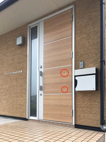 まだ築2年ということでドアもまだまだ綺麗です。赤丸のところは強風のため、ドアが開きすぎて隣のポストに接触して凹んでしまった様です。