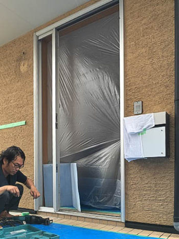ドア本体と袖のFIXガラスを外し、切断するための養生をしました。