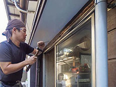 今回サッシのすぐ上に軒天(庇)があって気軽に解体という訳にはいきませんので、スタッフ/萩原の活躍は続きます。