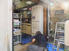 既存サッシの解体が始まりました。壁カットの場合には外壁を切断したりしますのでスタッフ/萩原(大工さん)の存在は欠かせません。