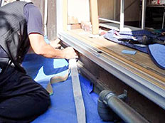 水平垂直やねじれの確認が済んだら固定し、枠周りに防水テープを貼っていきます。